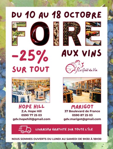 Importateur, grossiste et cavistes à Saint-Martin, Saint-Barthélemy et à Anguilla, l’équipe Grands Vins de France accompagne les particuliers et les professionnels en mettant à leur disposition un très large choix de vins, champagnes et autres effervescents, alcools fins, et spiritueux, verrerie, etc. Spécialistes des vins de France et du Monde, nous vous proposons plus de 2000 références incontournables dont de nombreuses exclusivités. Grâce à un nouvel espace de stockage dédié, à température contrôlée, qui accueille 400 000 bouteilles, Le Goût du Vin/Grands Vins de France répondent à vos demandes et commandes d’envergure ou à l’unité.